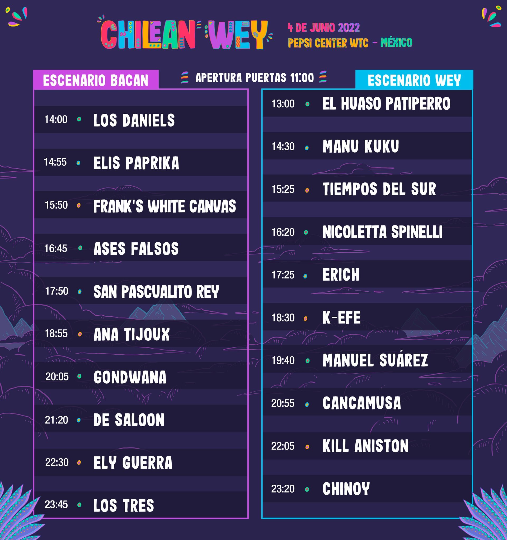 La primera edición del Festival Chilean Wey será un encuentro que conjunta lo mejor en música, emergente y comercial chilena y mexicana, así como distintas actividades, que se realiza este 4 de junio en el Pepsi Center WTC de Ciudad de México. Acá te dejamos los horarios: